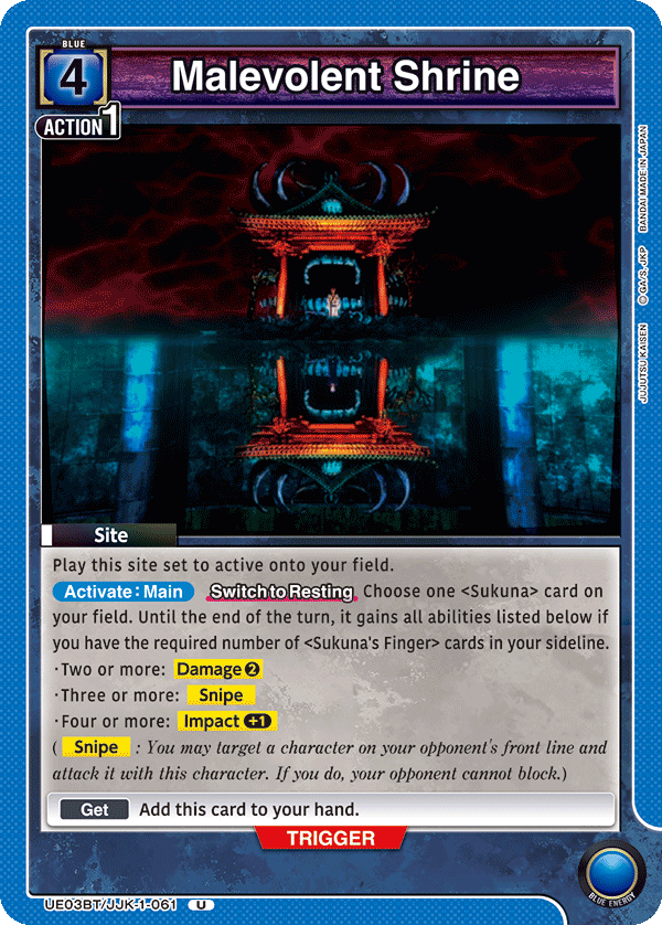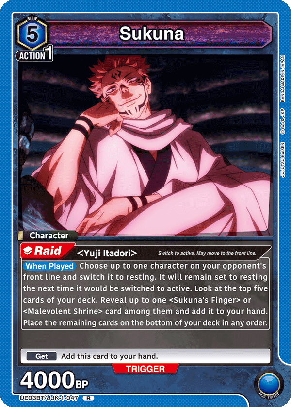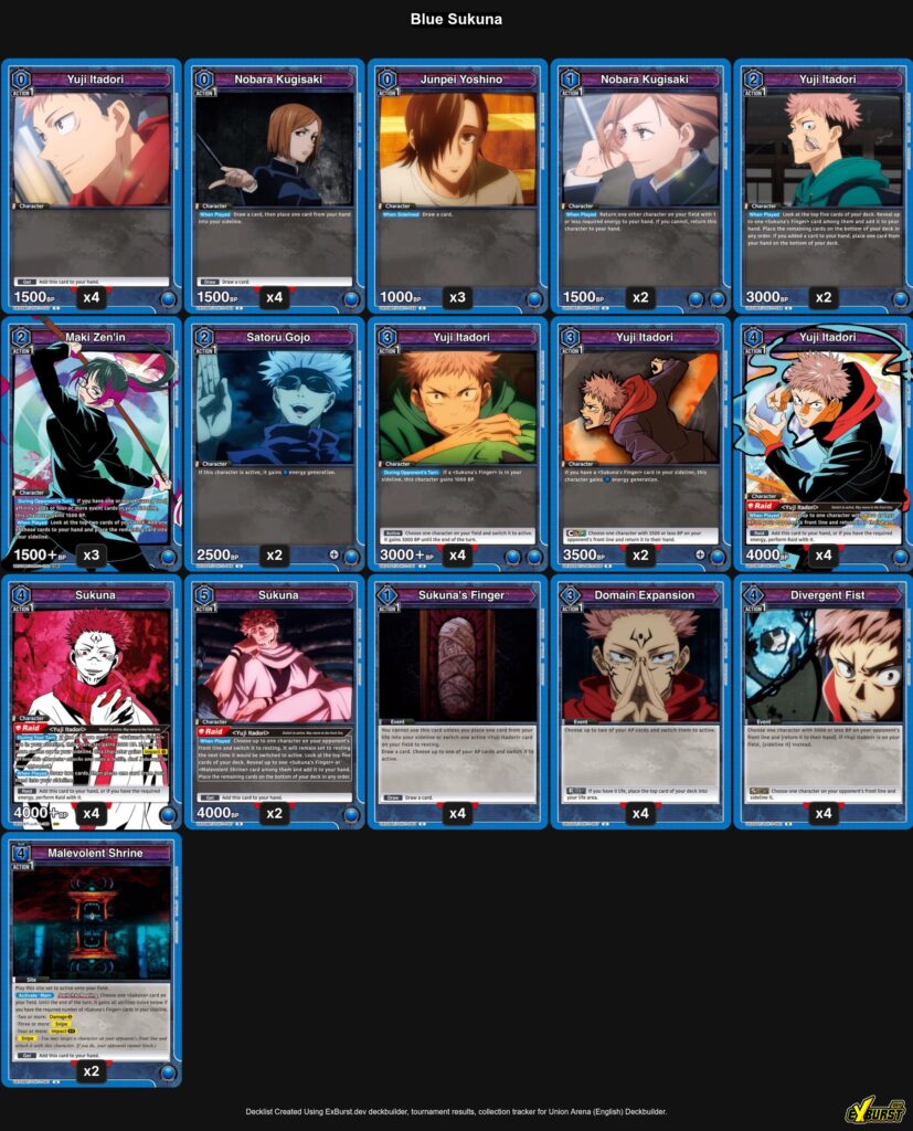 Kiegészítés: a Union Arena eltöröt egy korlátozást, így már lehet együtt használni 2 energia és 1 AP költségű kereső Itadori-t, illetve a 4 energia és 1 AP költsgű Sukuna-t, ebből adódóan újra népszerű és erős deck lett a Kék Sukuna. A legutóbbi amerikai regionális versenyen 3. helyezést értek el vele.