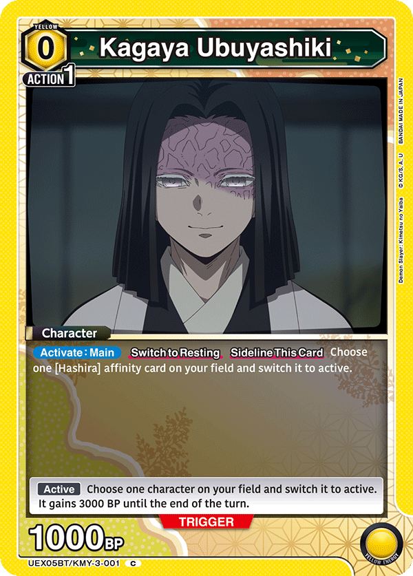 Ez a Kagaya sokkal, de sokkal hasznosabb, mint az eredeti Kagaya, amit még az alap szettben kaptunk, és lehetővé teszi a pakli egyik legnagyobb problémájának megoldását: hogy szinte nincs olyan karaktere, amely aktívan érkezne. Használd Kagaya-t, hogy bármelyik Hashira karakteredet aktívba forgasd a kijátszása körében. Bár ez inkább csak elfedi a Hashira alapvető problémáját, mégis segít a Raid-es karakterek hiányán, amivel a pakli szembesül.