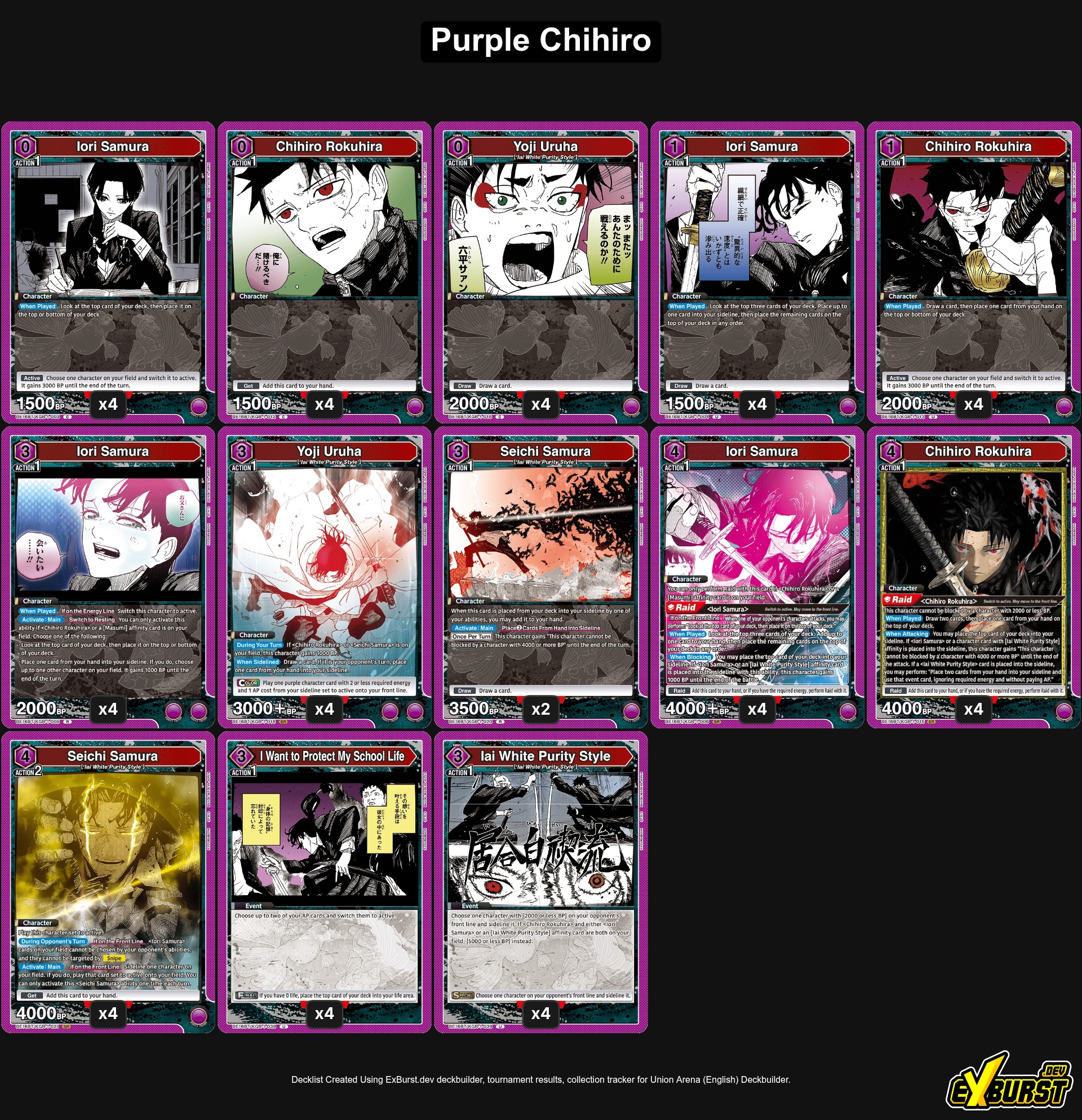 Ez a Lila Chihiro pakli őszintén szólva nagyon szórakoztatónak tűnik. Bár messze nem olyan meghatározó, mint a Piros Chihiro, rengeteg olyan egyedi mechanikával rendelkezik, amellyel biztosan képes meglepni még a legerősebb ellenfeleket is. A legismertebb lapja vitathatatlanul a négy energia költségű Raid-es Chihiro.