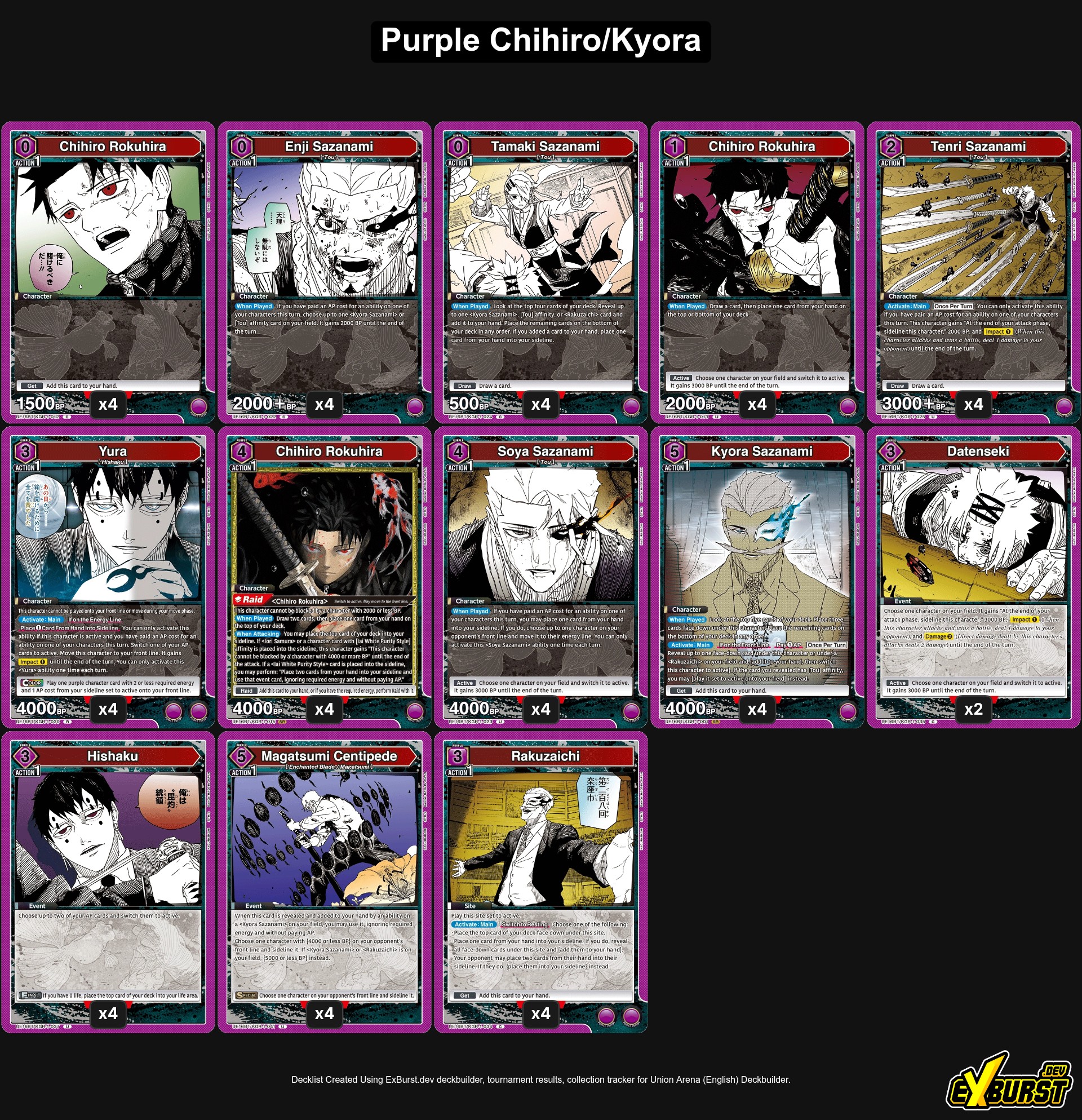 Mint sok más szett esetében, a Kagurabachi lilája is úgy tűnik, hogy nagy az átfedés a paklik között. Az ebben az összeállításban használt kártyák a Sojo-központú pakliban is bevethetők, és a saját, Iorival kiegészített paklijából származó Chihiro is jól illeszkedik ide. De ennek a szettnek az esetében a Piros Kagurabachi vitathatatlan trónja mögötti egyik legerősebb pakli talán ez a Chihiro/Kyora összeállítás.