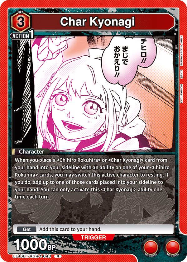 Kagari talán hiányolja azt a közvetlen eltávolító képességet, amivel a piros Chihiro rendelkezik, de ez a kártya kétségtelenül hatalmasat üt azzal, hogy egyszerre biztosít Damage 2-t és Impact 1-et mindössze öt energia költség mellett. Ez az egyik legerősebb kulcsszó kombó, amit kaphatsz, és általában a magasabb energiájú, vagy a nehezebben teljesíthető feltételekkel rendelkező kártyákon találod meg.